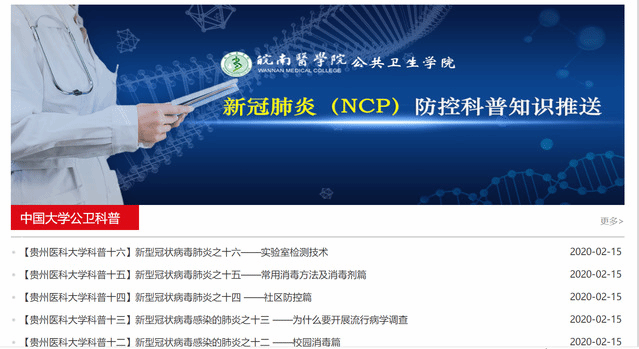 疫情期间,各位教师党员利用专业知识,分工合作,搜集整理了新型冠状病毒肺炎专业防控知识,同时期在学校网站主页和微信公众号开设了新型冠状病毒肺炎专业防控知识推送专栏,开展科普工作。栏目内设置了中国大学公卫知识科普、疾病预防控制中心知识科普,医疗机构知识科普等分类科普指导等内容,后期将不定期更新推送相关专业知识,充分发挥党支部的战斗堡垒作用和共产党员的先锋模范作用,为全校师生了解和预防新冠肺炎助力,为全国抗击新冠肺炎助力。