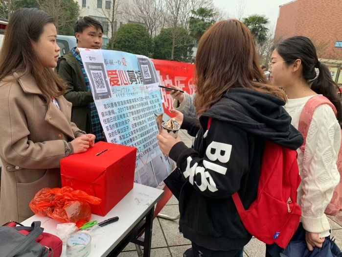 2019年3月14日,williamhill威廉希尔2016级预防医学专业学生唐春慧在水滴筹平台发起救父筹款活动;17日-18日,2016级邢长明、郭静柔等15名学生党员在芜湖市赭山公园北门、中山路步行街、学校新老食堂门口为募集唐春慧救父善款举办现场募捐活动,线上线下共募集善款58618.97元。